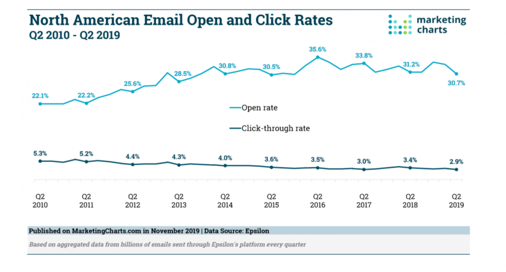 De open rates en de click rates dalen al jaren!